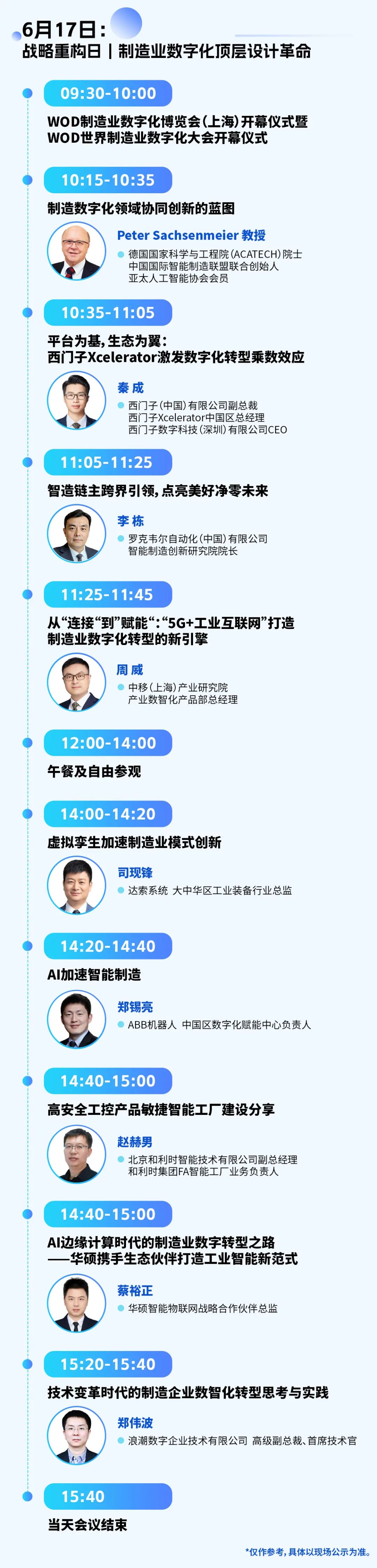 同期举办的WOD世界制造业数字化大会、系列WOD数字化转型高峰论坛数字化工作坊、主题社交活动等10余场活动设置18个前沿议题,主题聚焦黑灯工厂、智慧供应链构建、人工智能、ESG转型与数字化协同等,同时设置食品饮料、电子行业数字化转型专场,届时将集结来自工业和信息化部电子第五研究所、中国化工企业管理协会、西门子艾闻达、大陆汽车、微软、施耐德电气、SGS通标、法奥意威、智慧芽、树根互联、华为云、广汽埃安、美云智数、知果集团、赛意信息、欧普照明、京东物流、今天国际、KUKA(中国)、旺旺集团、西得乐、布勒、青岛啤酒等企业代表进行数字化实战分享,为来自汽车、电子、装备、石化、食品饮料等行业的制造业数字化负责人提供丰富、多元的参与场景,提升数字化系统认知,重塑数字化领导力。