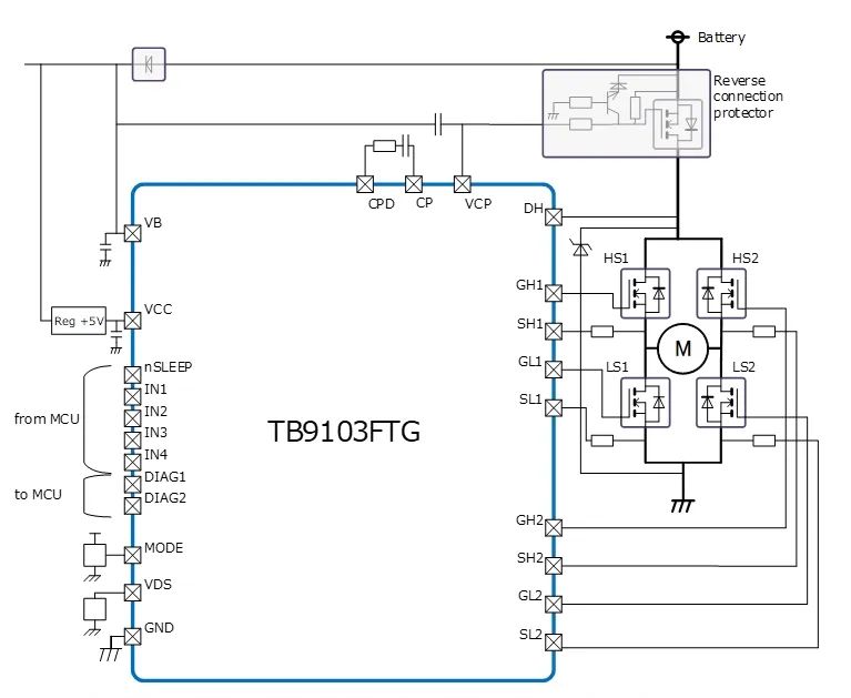 TB9103FTG可为无需速度控制的有刷DC电机提供优化的栅极驱动器功能和性能,为实现更紧凑设计开辟道路。它具有一款内置的充电泵电路[4],其可确保为驱动电机的外部MOSFET供电所需的电压。此外,它还具有栅极监控功能,可通过为高低边外部MOSFET自动控制栅极信号输出时序,防止生成直通电流。