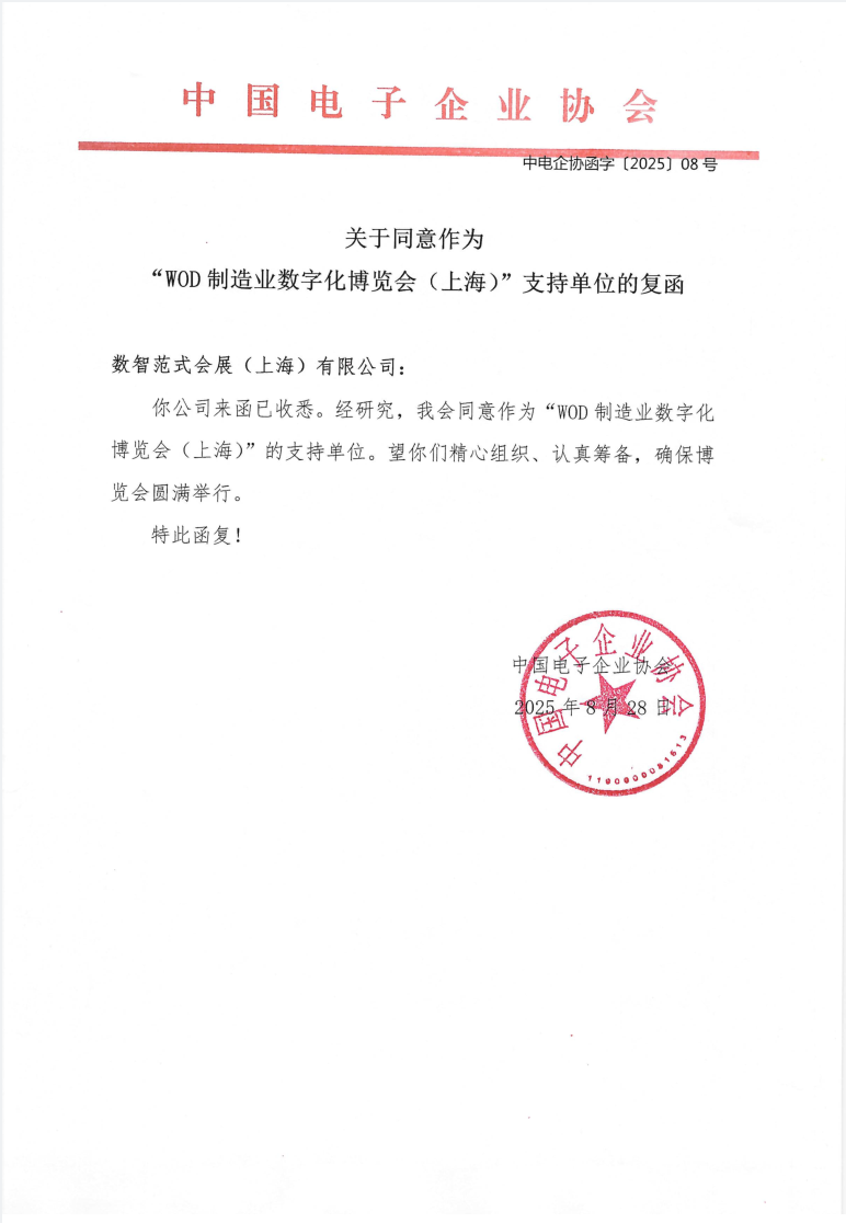 2025 年 9 月 2 日,WOD 制造业数字化博览会组委会官宣:中国电子企业协会(简称“中电企协”,英文缩写CEEA)正式成为 2026 年WOD制造业数字化博览会支持单位,双方将共建 “电子信息制造数字化专区”,聚焦新技术推广、产业链协同及产业生态构建,加速电子信息制造业向高端化、智能化、绿色化转型。