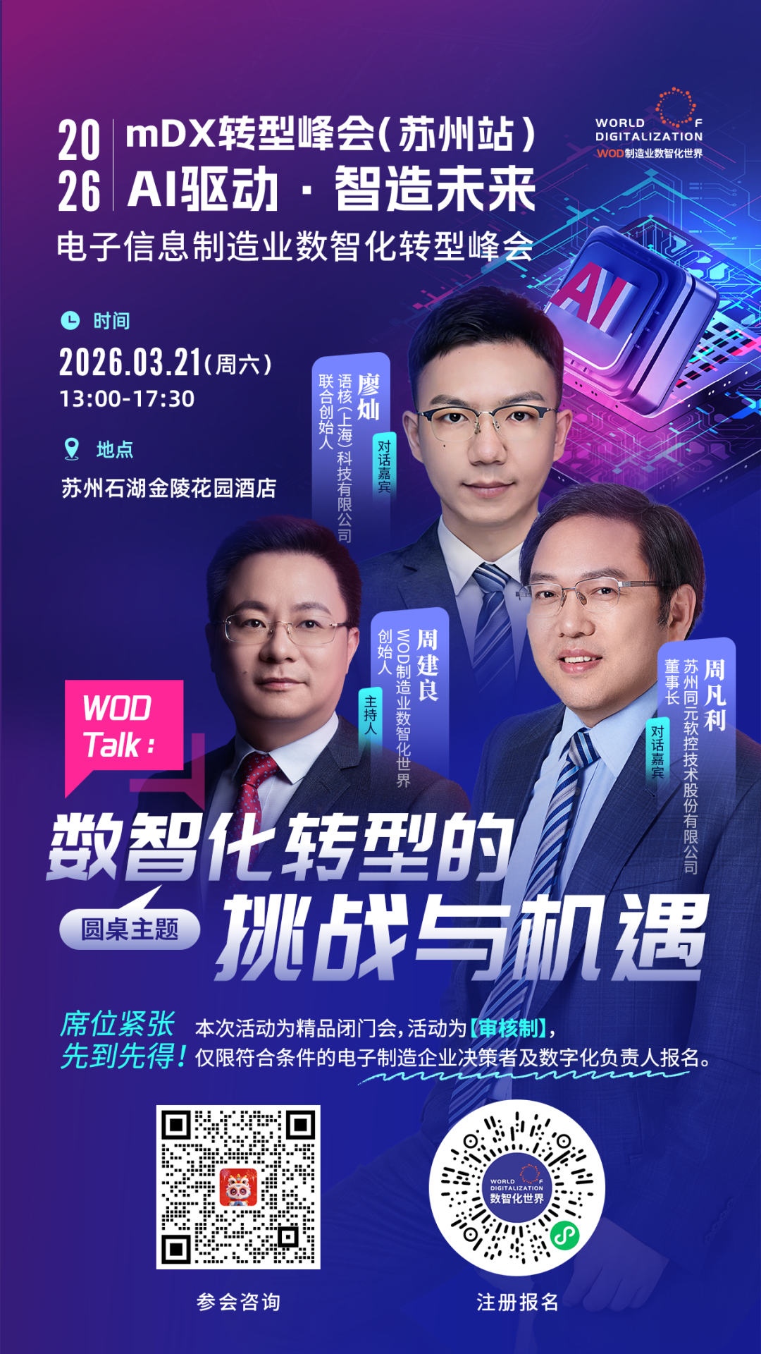 当 AI 成为制造业数智化转型的核心引擎,电子信息制造业正迎来从数字化到智能化的范式变革。由WOD 制造业数智化世界联合深圳市终端电子制造产业协会、广东省电子学会 SMT 专委会—— 两大深耕电子制造产业链多年的产业资源枢纽,共同举办的 mDX 电子信息制造业数智化转型峰会(以下简称“mDX转型峰会”)将于2026年3月21日在苏州举行。