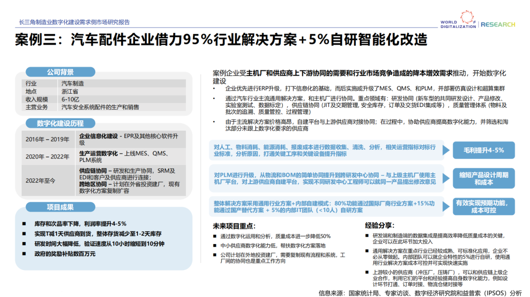 企业数字化、智能化转型,除了上下游供应链有效协同以外,在行业市场竞争中也能实现降本增效的目的。《长三角需求侧报告》中对中国前TOP6的制造业数字化改造进行了案例解析,其中专门针对汽车配件企业“降本提效”结果给出了较为详尽的数据。