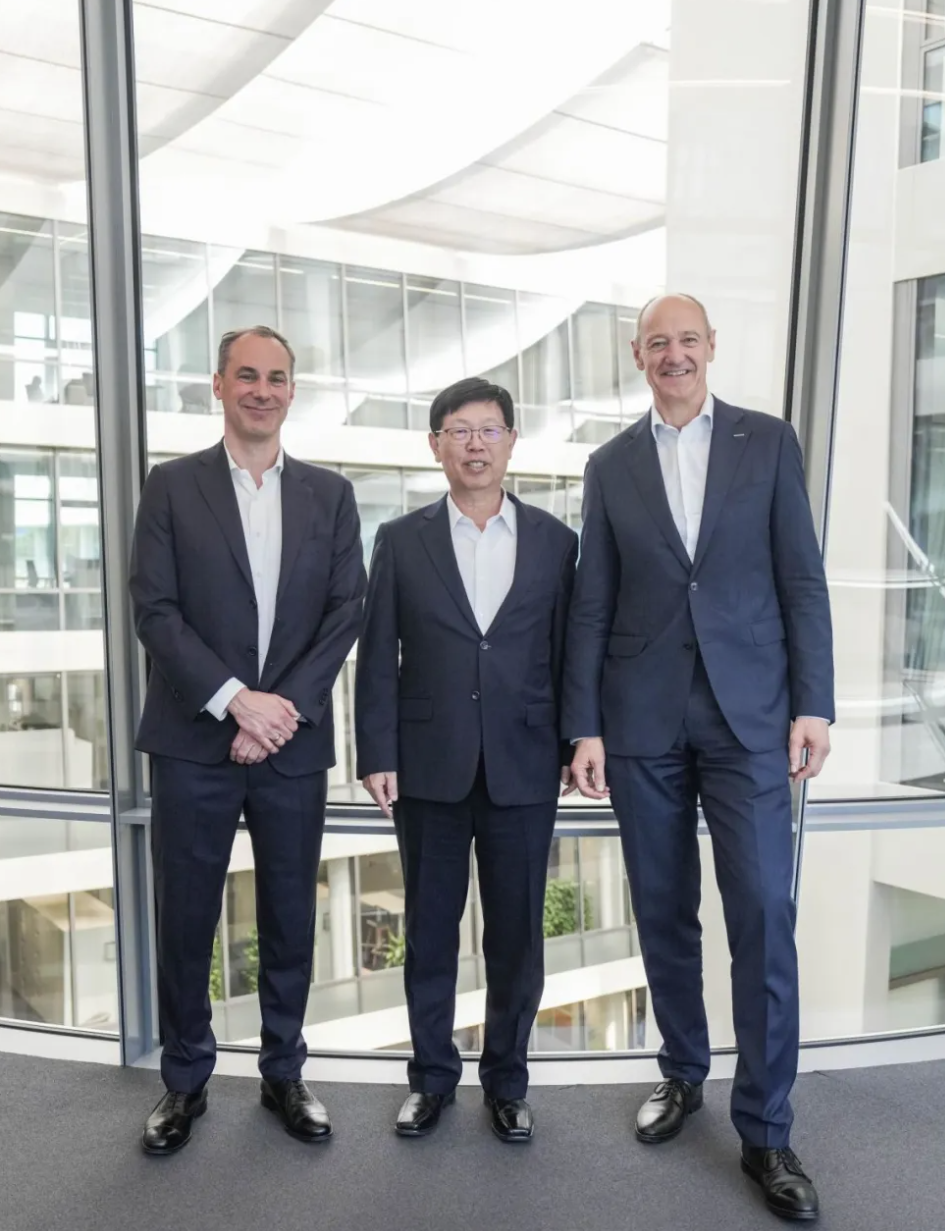 西门子董事会主席、总裁兼首席执行官Roland Busch(右),富士康董事长兼首席执行官刘扬伟(中),西门子董事会成员、西门子数字化工业集团首席执行官奈柯(左)